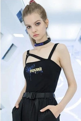 Another top perfect for the hot summer nights is the gothic inspired spired web top. Again, the main and most dominant color is black. It is also the base, upon which the front logo and the spider-web image are printed. The spider-web comes a bit to the upper right side, creating a heart-shaped image. The punk rave logo comes on the left. Another thing that makes this top extra unique are the straps, connected in with an additional diagonal one.