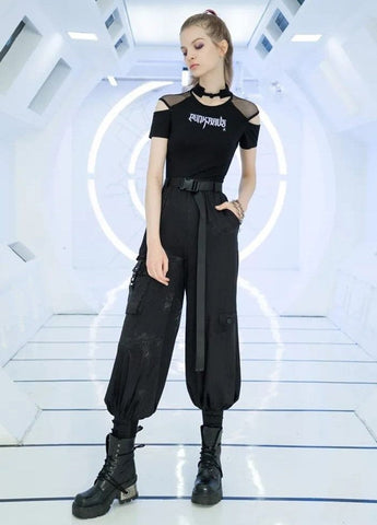 Mesh and asymmetry come together on another gothic inspired t-shirt. The cutouts on the short sleeves are divided between the mesh and the full fabric. The neck has a round opening and an interesting detail that resembles the look of a double belted collar. The base is black, with only the logo on the front coming in a lighter silver shade. It is embroidered on the shirt, creating dimension and definition.