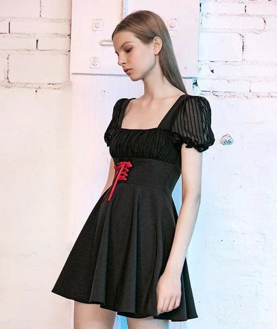 The A-line cut is perfect for all those looking for something short and sweet. The sheer fabric comes on top, and the sewed-in waist belt defines the silhouette. The red lace-up detail brings just enough color to make this dress unique.