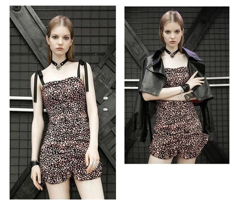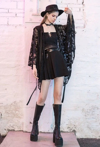 Keeping the punk and goth vibe through the newest arrivals, this jumpsuit features a mixture of trendy and goth lines. The first and most dominant detail on the entire jumpsuit is the mandarin collar that comes in height somewhere in the middle of the neck. The cap sleeves are loose and fall over the shoulders. The belt accents the waistline and defines the upper from the lower part. The shorts of the jumpsuit are also wide, easy to move around. The cute detail on the look-a-like-pocket on the top part of the jumpsuit features spider-web embroidery.