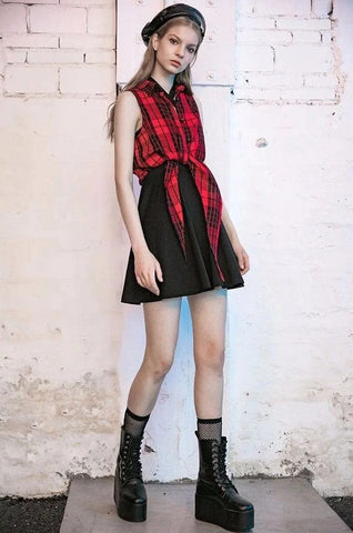 The plaids are never getting out of style. Especially the red-black color combinations. This goth-inspired shirt comes without sleeves and brings the 70s styles back with the wrap at the front.