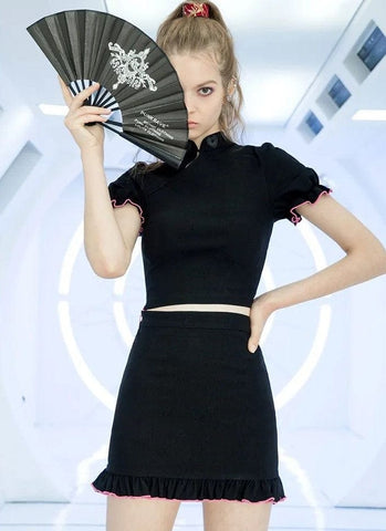 This crop top is all you need this summer. Perfect for styling with both skrit and pants, it is the total hit among the girls. The ruffled top with the side mandarin collar and cute puffy sleeves create this trendy piece.