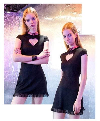 If you want to show some love, then you can do it with this extraordinary dress. Form-fitting and tight, it features a big heart on the front that makes up for the lack of cleavage. The collar is punk inspired and resembles a belt, and the ends of the dress finish are ruffles in soft lace.