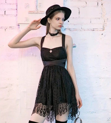 Black color and lace is considered a very sexy combination. This dress shows exactly that plus a Goth vibe. The lace skirt is entirely asymmetrical and pointy, while the top is tight, with overlaid straps on the waist area.