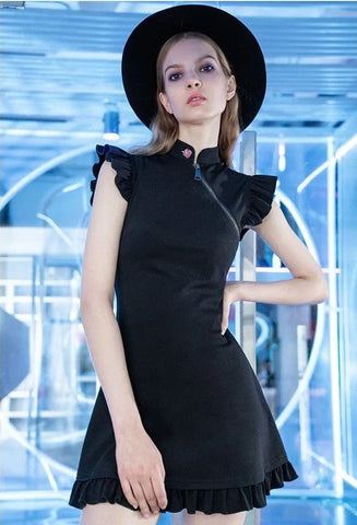 A similar variant to the dresses mentioned above is this one, featuring a side zip on the upper top part and divided collar. The sleeves are voluminous and ruffled, making it look very Goth and chic.