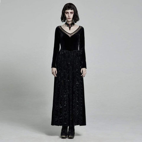 Looking ravishing in a maxi dress with goth style is easy if you have this dress hanging in your closet. The combination of velvet top and flare bottom is one of a kind. The V-neck opening is wide, followed by a subtle see-through mesh.