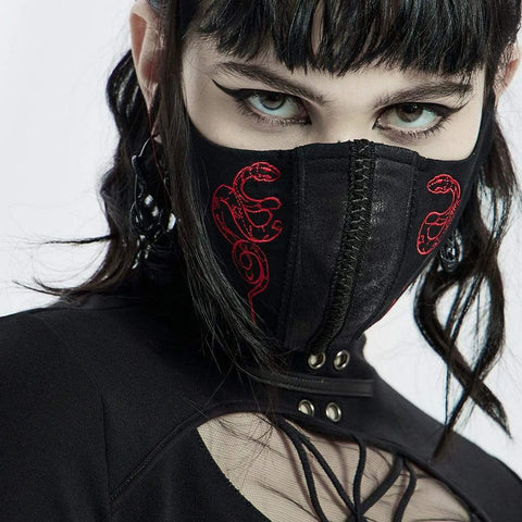 Side snake print in red that comes on the black base, makes this face mask look strong and dramatic. The front stitching adds to the uniqueness of the look.