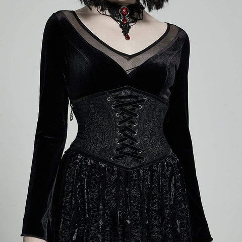 One can never have too many little black dresses. For goth lovers, this is one of the favorite garments that every girl gladly chooses. This short black velvet dress is cute and sexy. The mid-high neck comes with a bow tie. The front is nice, with lacing that shows off some skin. The line of the dress follows the body, and the skirt opens up with volume.