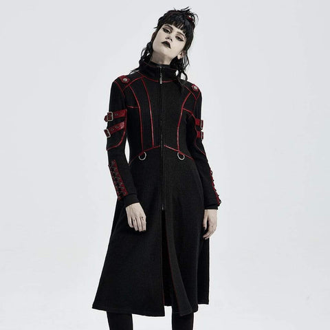 The goth style can be represented through many different and varied pieces, such as the military one. The military-style of this coat is what shows how the current fashion can be mixed with this particular goth style. The coat is black, military-style inspired, with the length reaching the knees. The details like the stitching and the belts on the sleeves come in shiny red color, creating the perfect contrast.