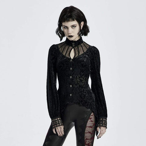 The elegant Gothic look requires wearing some see-through mesh, preferably in black. Well, this fabulous shirt is the piece that you will gladly wear for any more elegant occasions, and still keep to your fashion style. On a first look, you can see the long sides that make it pretty extraordinary. The high collar is connected to see-through mesh, making a front cutout. The entire shirt is covered in a discreet floral pattern.
