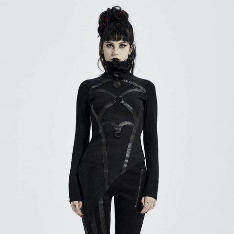 Dramatic and original, this is a shirt that is one of the pieces that are must-have goth garments. Long sleeves, high collar, asymmetric length, and faux leather straps and just some of the details making it a piece that will stand out.