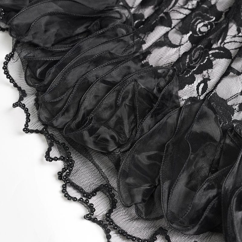 Its sweetheart neckline features delicate floral beading, while the back lace-up closure and ruffled mini skirt amplify its gothic charm. The layered lace fabric adds ethereal depth, balancing bold design with playful wearability.