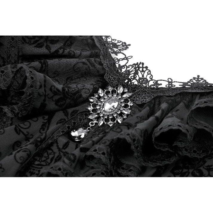 The sleeves are architectural in design — a voluminous arc-shaped puff shoulder blends into layered sleeves trimmed with intricate lace, creating a sculptural, dramatic silhouette worthy of a dark queen.
