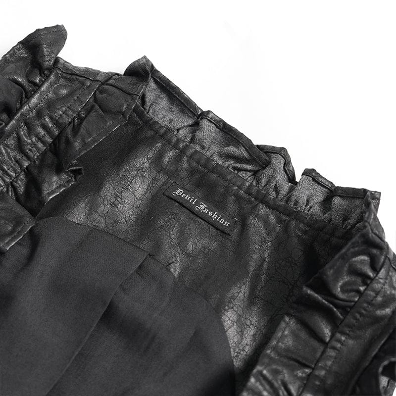 Its front features a central zip closure and side lace-up detailing, while the ruffled trim and swallow-tailed hem amplify its steampunk attitude. The distressed, weathered texture adds a bold, mechanical touch that stays true to the aesthetic.