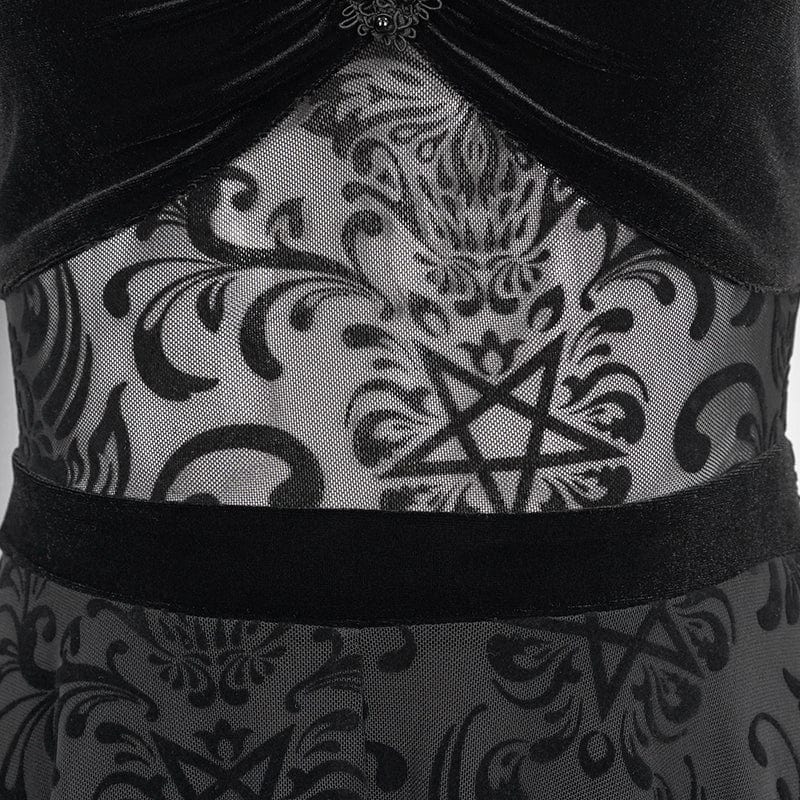 This gothic midi dress is velvet patchwork with mesh fabric. The star-shaped strap on the neckline. Hollow-out, beaded, ruched, and lace on the chest. Floral print on the mesh and irregular hem. Elastic design on the back for adjustment.