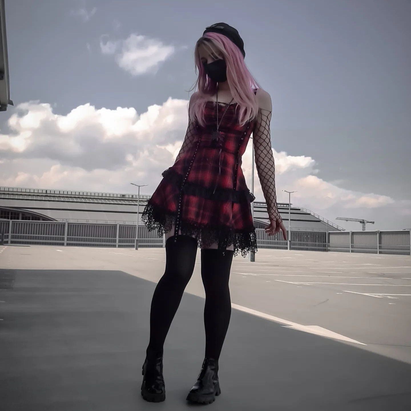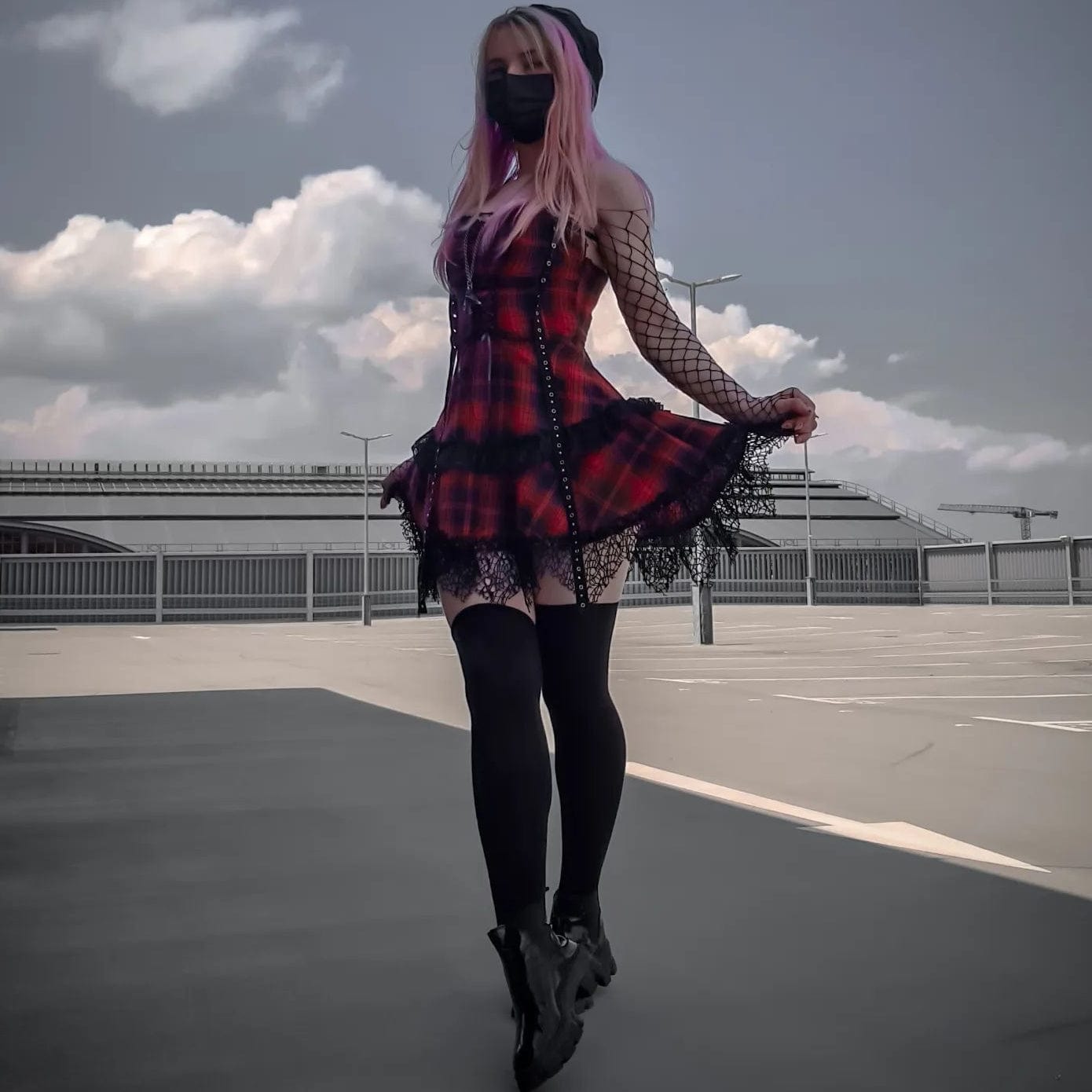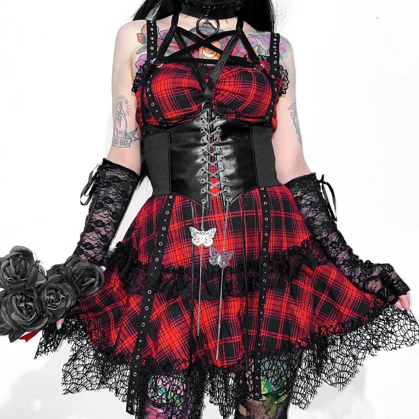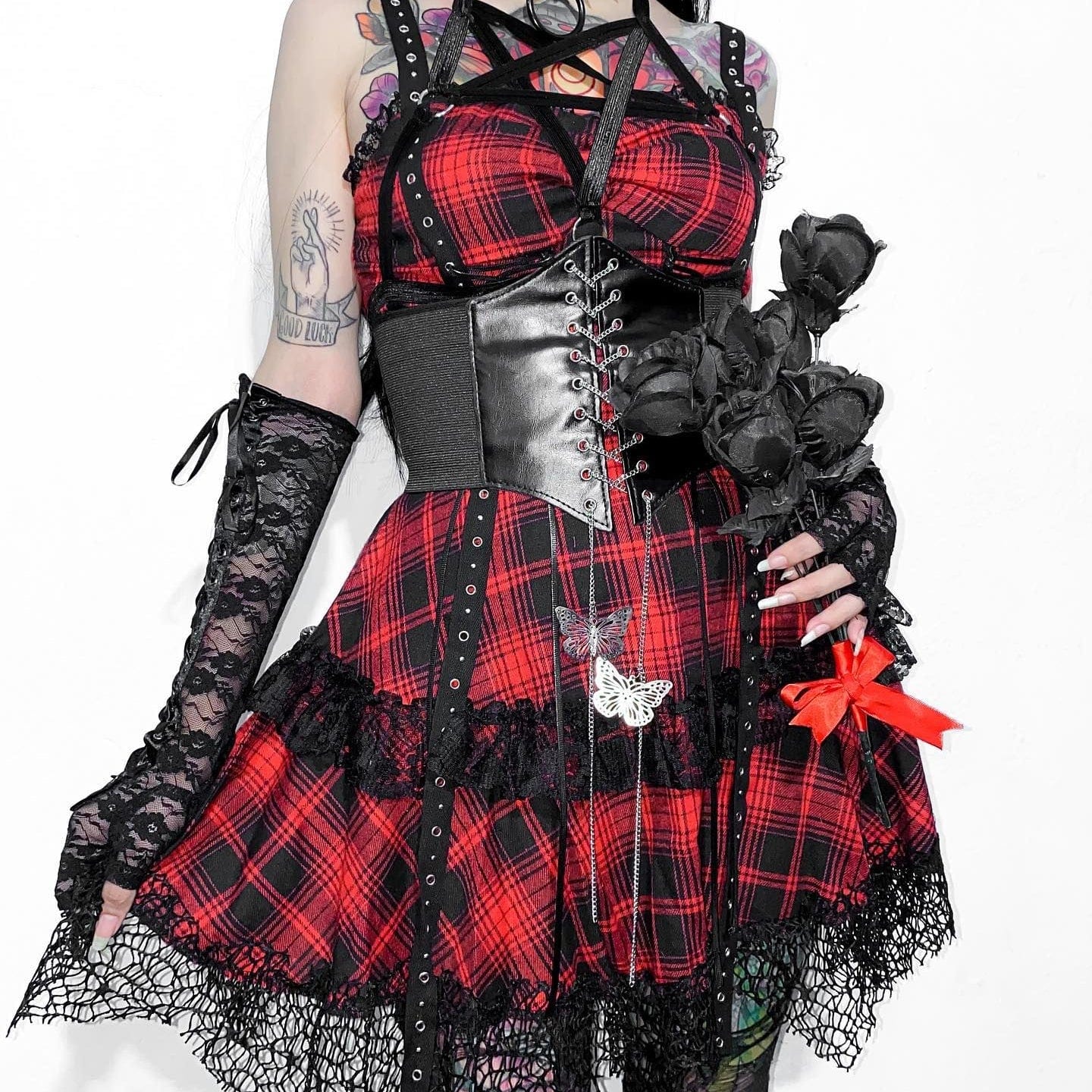 Women's Grunge Red Plaid Lace Hem Slip Dress