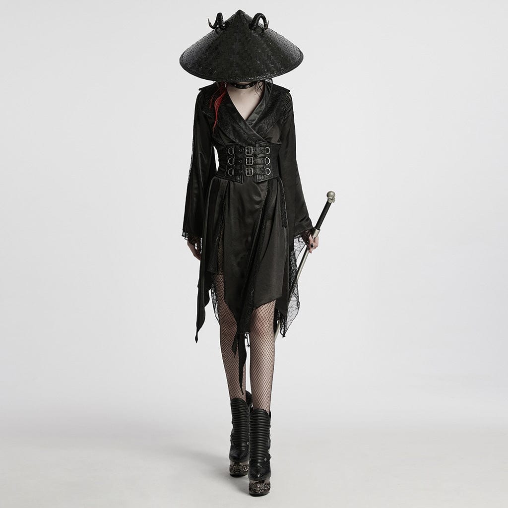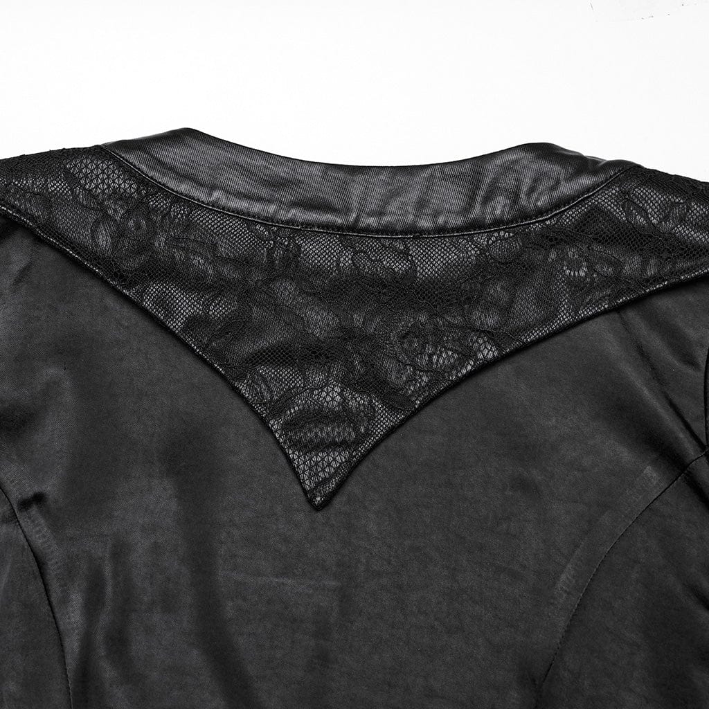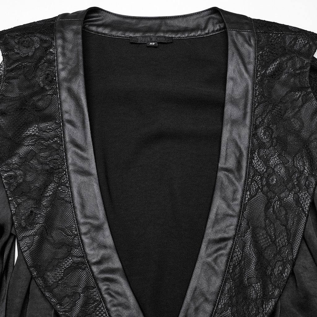 The lace detailing along the shoulders and sleeves adds a romantic yet edgy touch, enhancing the gothic allure of this piece. The asymmetric hem adds an element of intrigue, creating a dramatic effect with its flowing lines. The V-neckline and lapel collar give it a sophisticated yet rebellious appearance, perfect for anyone looking to add a touch of gothic elegance to their wardrobe.