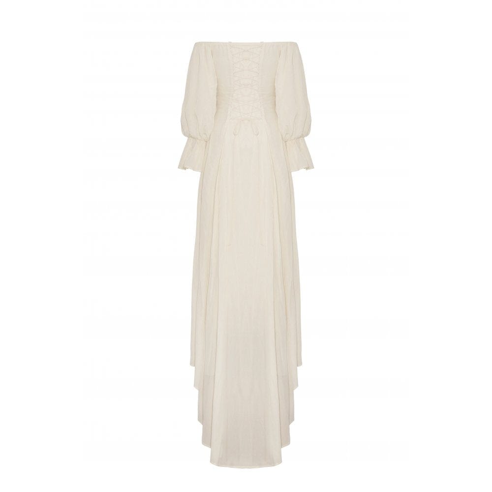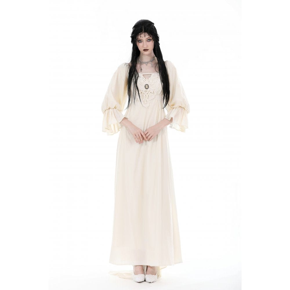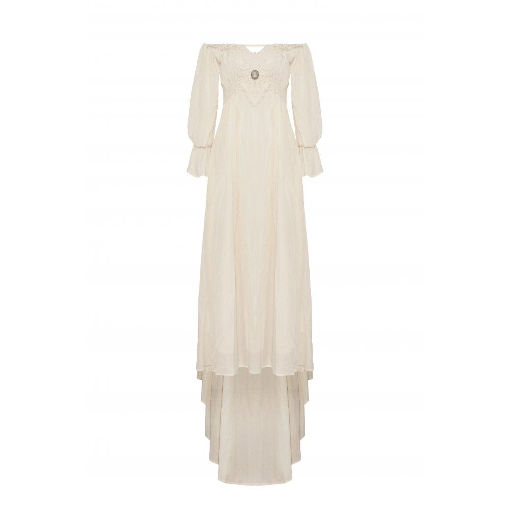 This steampunk dress is a high-low design and can be worn off-shoulder. Puff Sleeves with the flared cuffs. Patchwork with lace on the chest. Lace-up on the back for adjustment and zipper for closure. No elastic fabric.