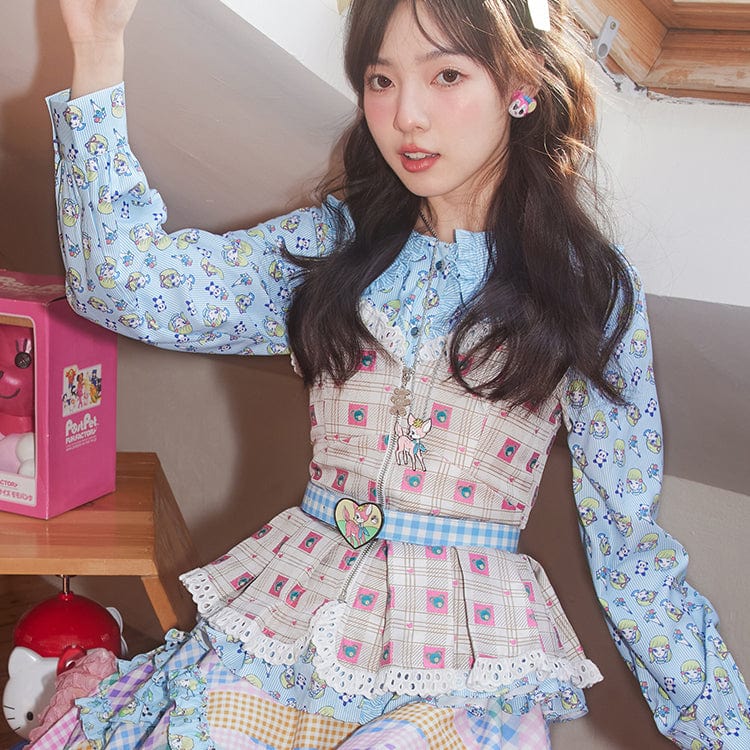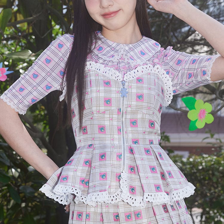 Women's Pink Kawaii Bear Embroidered Plaid Zipper Tank Top