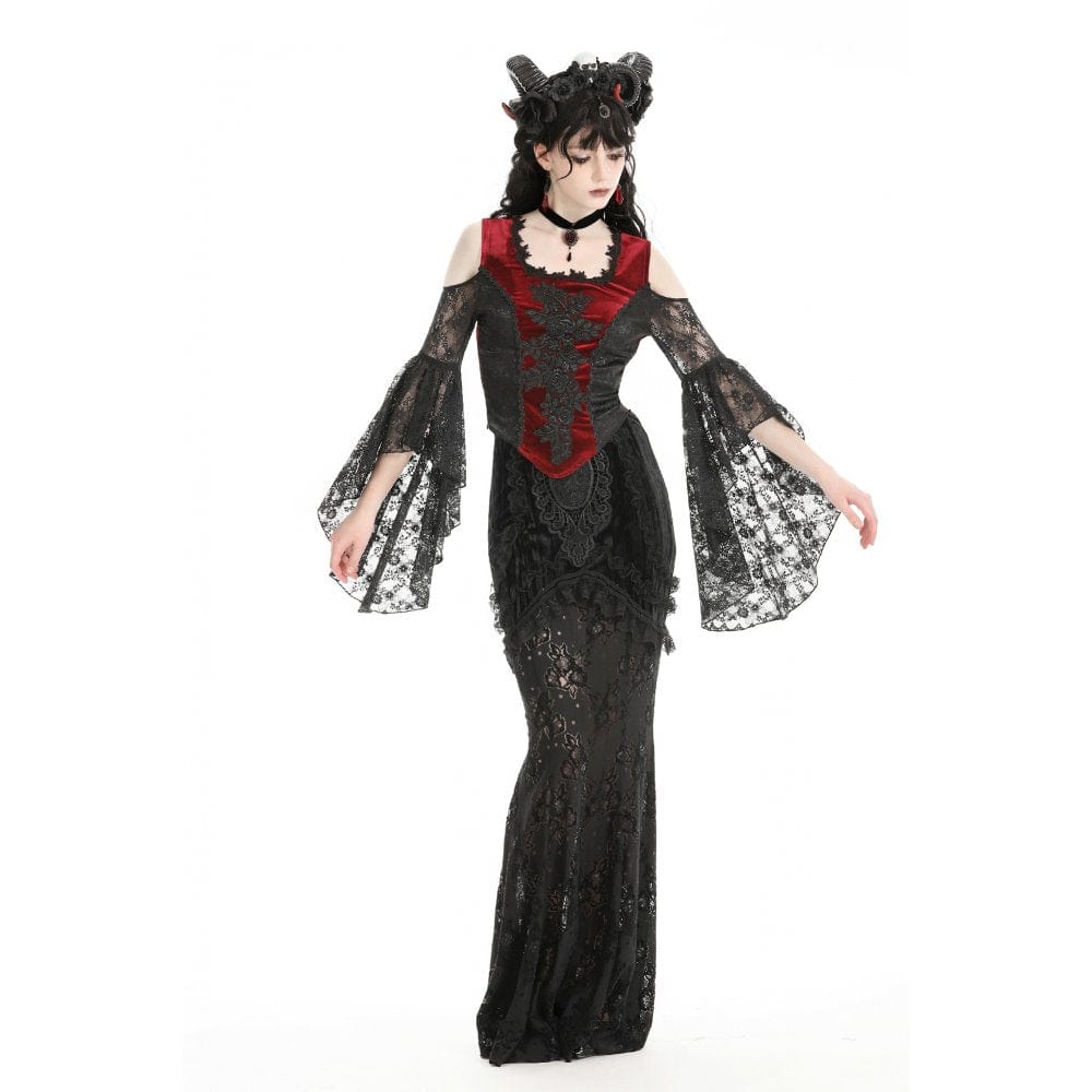 The lace sleeves of the top boast flared cuffs, creating a dramatic and captivating look that is perfect for gothic or romantic-themed ensembles. The intricate floral embroidery on the front adds a touch of intricate beauty, enhancing the top's overall appeal.
