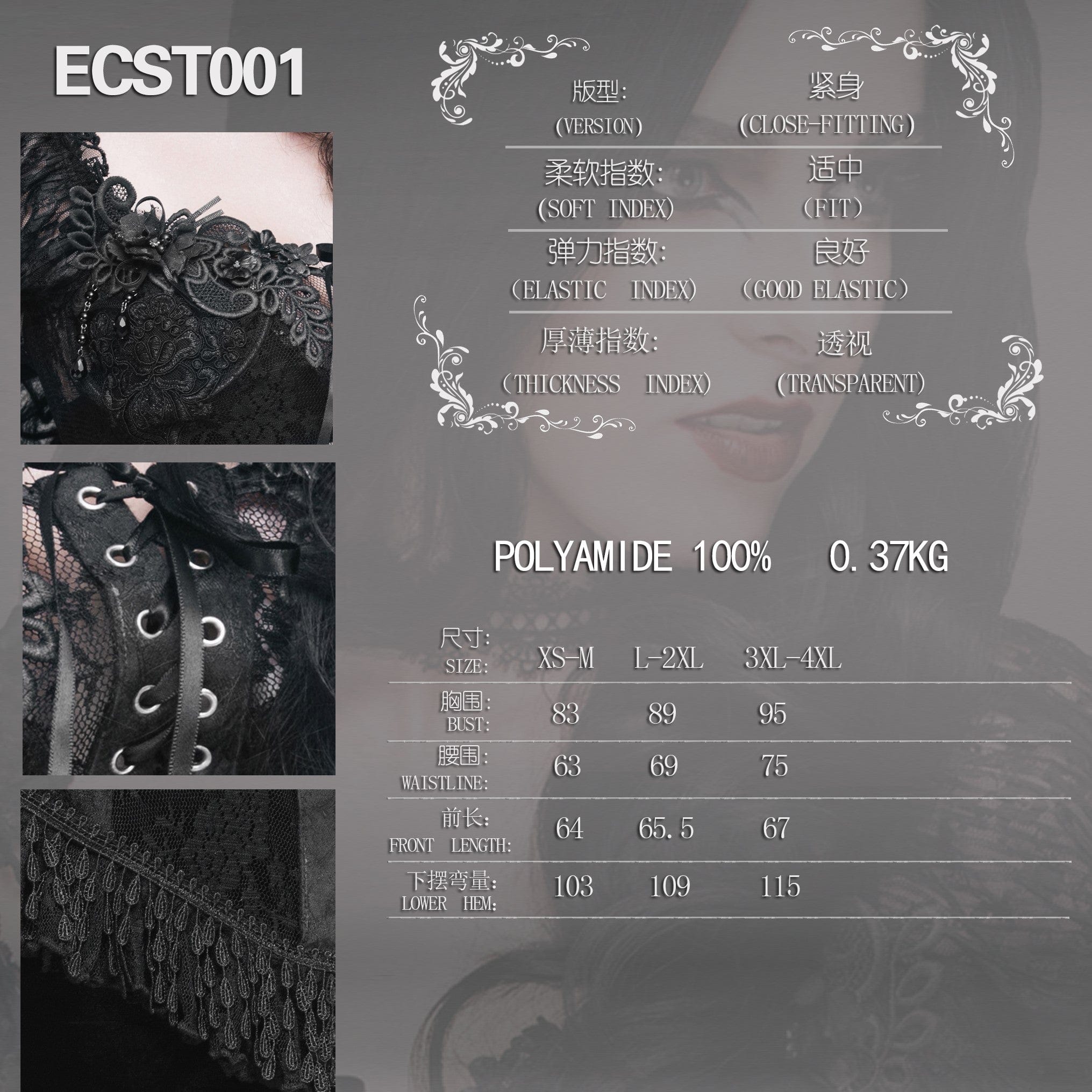 Descripton:Wear it like a corset or use it as a top, this versatile garment is created completely out of exquisite lace. It has short puffed sleeves and a wide sweetheart neckline. The hem is trimmed with tassels. Th front opening fastened with a row of buttons and ribbon lacing at the bust.