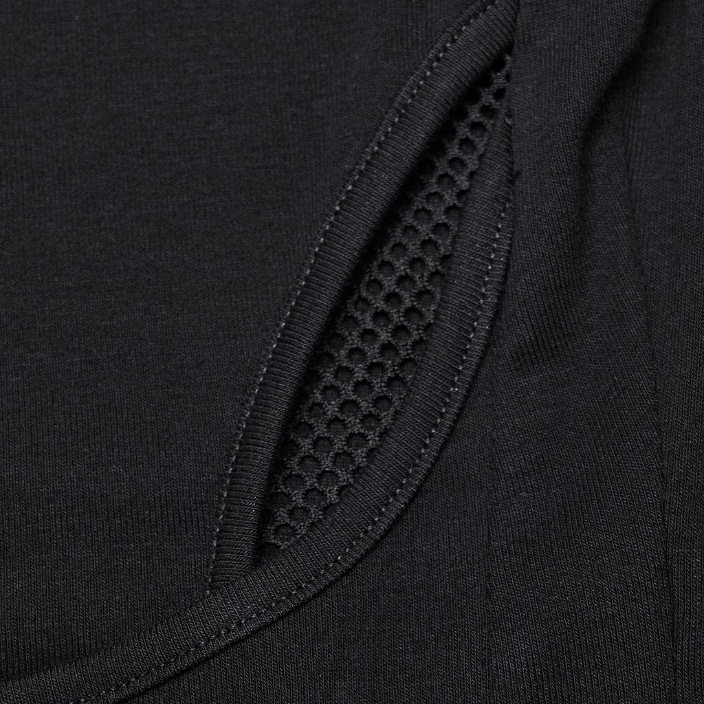The mesh patchwork on both sides of the shirt provides a bold contrast to the solid fabric, creating a dynamic visual effect that plays with transparency and texture. This mesh detailing not only adds a punk-inspired flair but also enhances breathability, making the shirt as practical as it is stylish.