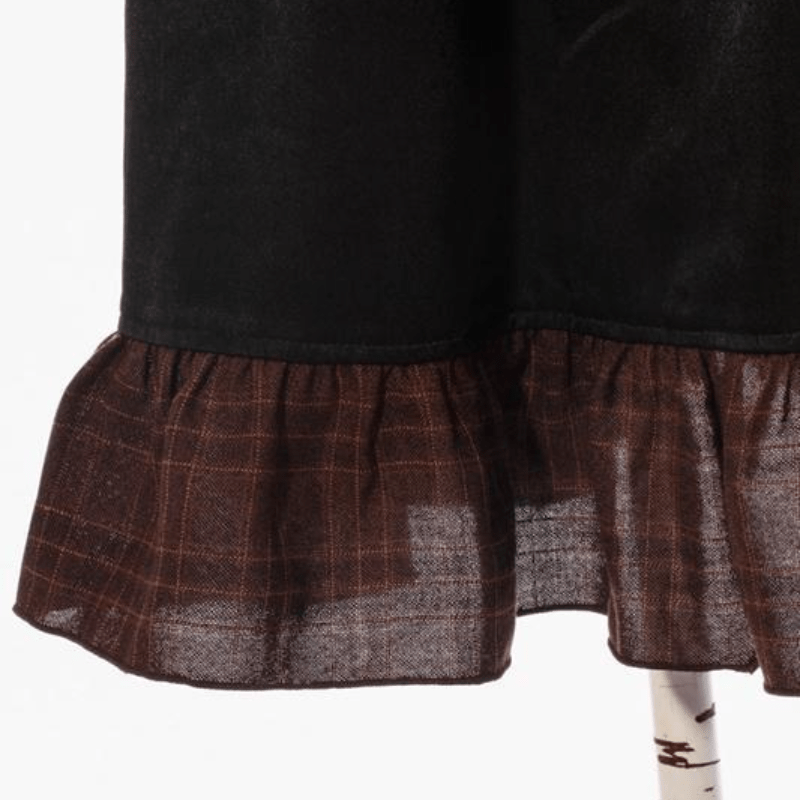 Description:Styled like a vintage goth maid's dress, it has a long yoke with net inset at shoulders. The gathered skirt starts at the hipline and falls gracefully down to the calves. It is edged with a chequered fabric frill at the hemline. The sleeves are made with delicate lace and are gathered at the wrist with a little ruffle.