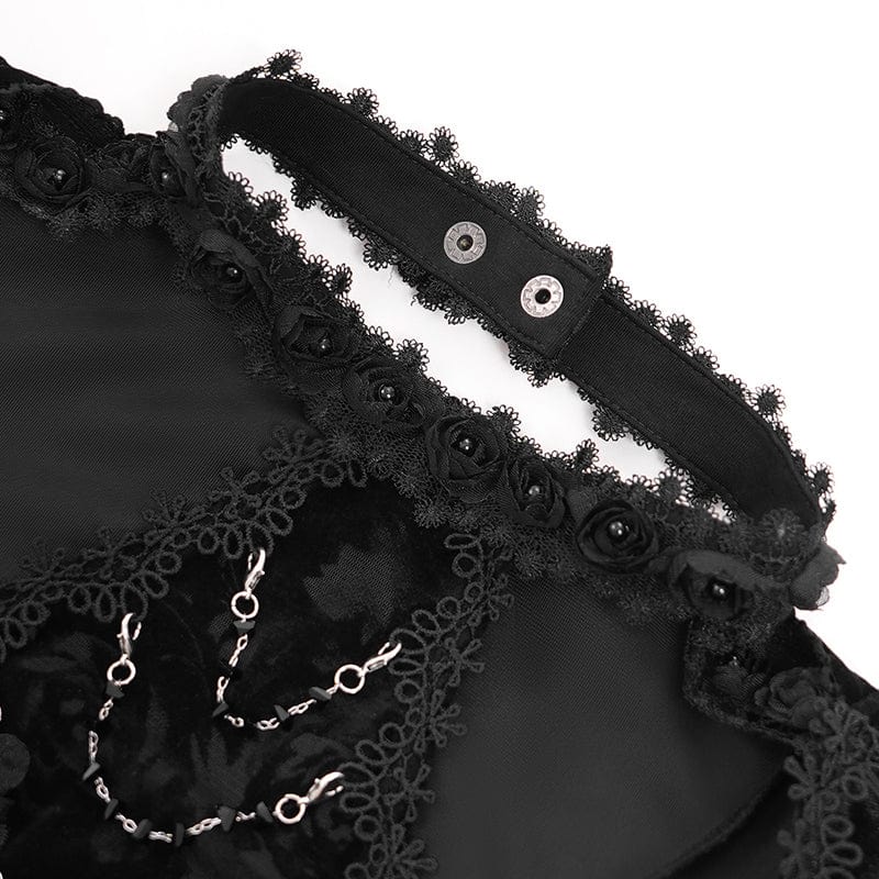 Adding to its dramatic appeal, the lace halterneck with button closures enhances the gothic charm while ensuring a secure fit. The layered chains draping across the neckline introduce an edgy, statement-making element, perfect for those who love bold details. A floral decoration on the bust further refines the aesthetic, blending romantic and darkly enchanting elements into one cohesive look. Designed to flatter the silhouette, the slim-fitted waist accentuates curves, while the pointed hem on the front creates a regal, elongated effect that complements a variety of gothic styles.