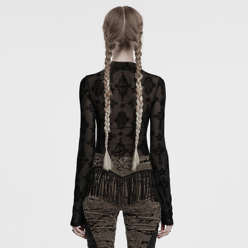 Women's Gothic Star Cross Flocking Mesh T-shirt
