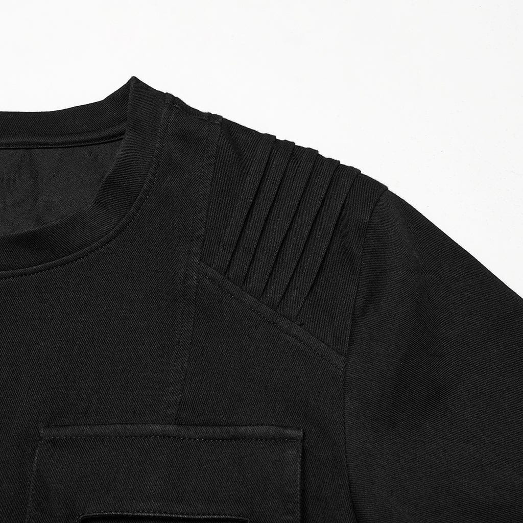 The design is completed with stylish shoulder ribbing, adding a touch of grunge texture to the shirt while elevating the overall look. Whether you’re pairing it with ripped jeans for an all-out punk look or layering it under a leather jacket for a more gothic rock vibe, this T-shirt is versatile enough for multiple occasions.