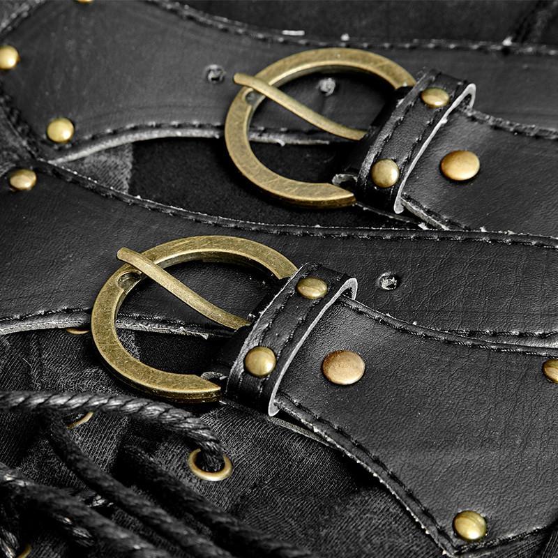 Looking for the perfect steampunk or Vintage Goth style top? Here is one that will steal your heart away. The all-black top has a V-neck and elaborate detailing on the front. Thick grommet studded tapes have been cleverly combined with string criss-cross lacing to create a very interesting effect. Two broad leather straps with heavy bronze buckles at the throat complete the tough macho look of this sleeveless top.