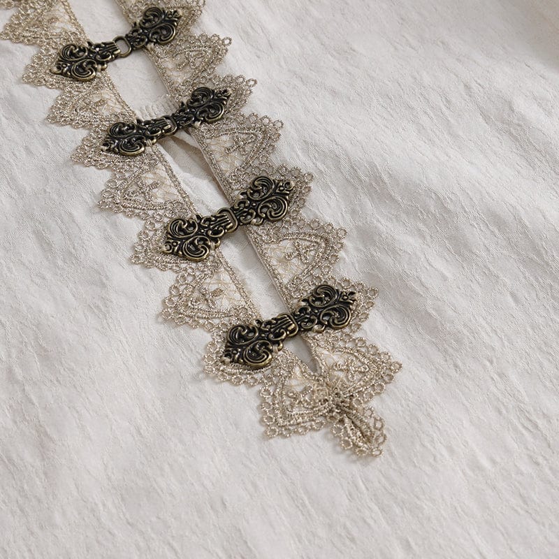 The slit neckline with a metal frog and lace hem offers a unique and eye-catching detail, perfect for showcasing your individual style. Gold lace patchwork on the shoulders adds a luxurious and opulent touch, elevating the shirt's overall aesthetic.