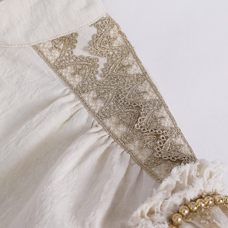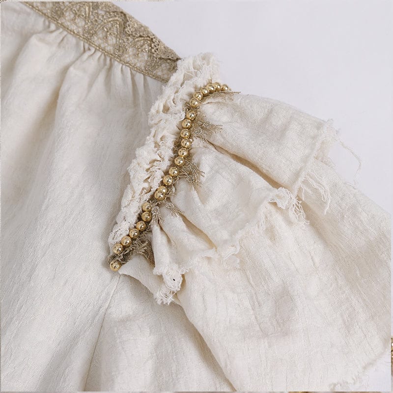 The standout feature of this shirt is the stand collar with a lace hem, adding a touch of Victorian sophistication and gothic romance to the design. The puff sleeves create a dramatic silhouette, while the layered ruffles adorned with beads add texture and visual interest.