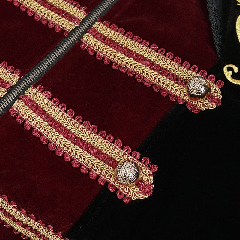 This gothic coat is a stand collar and a contrasting color. Totem Embroidery on the shoulder, cuffs, and back. Cross zipper for closure. Decorative button with detailed. Swallow-tail on the back and slim fitted silhouette. Avaliable in two colors.