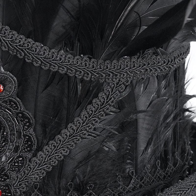 Atop this gothic marvel, an array of feathers of varying lengths is artfully arranged, giving the hat a dynamic and striking profile. These feathers add a dramatic flair, reminiscent of gothic grunge and gothic vampire aesthetics, ensuring you make a bold statement wherever you go.
