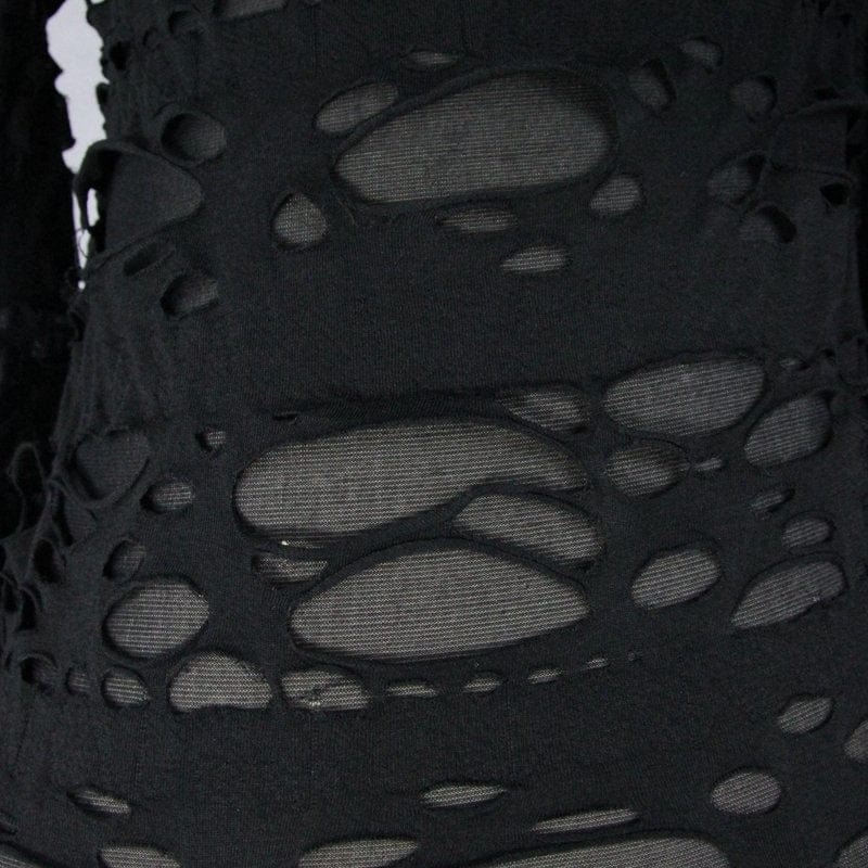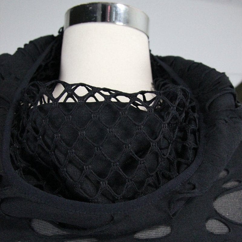 Description:This double layered t-shirt has mesh that is overlaid with ripped fabric to create a distressed t-shirt. The long sleeves are highly detailed with buckled straps, net and lacing featured together in a very aesthetically pleasing manner. The deep loose hood is lined with wide netting to create a very interesting look.