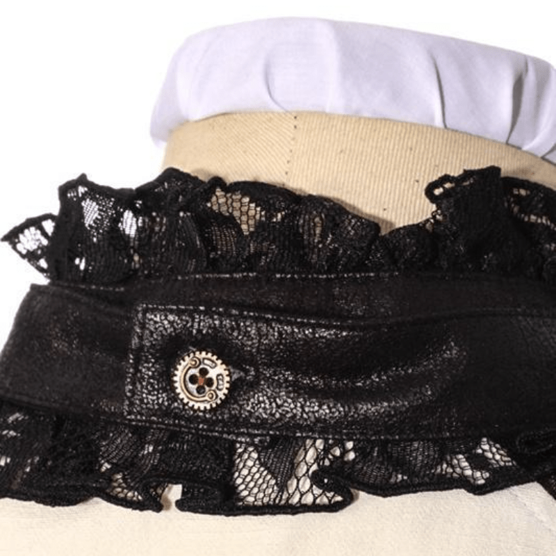 Description:High details are the highlight of this figure hugging top. It has leather trimming on the shoulders and a lace trimmed Jabot with gear and chain ornament at the throat. The front of the blouse has grommet and lace details on the waist. The full sleeves have a broad lace ruffle.