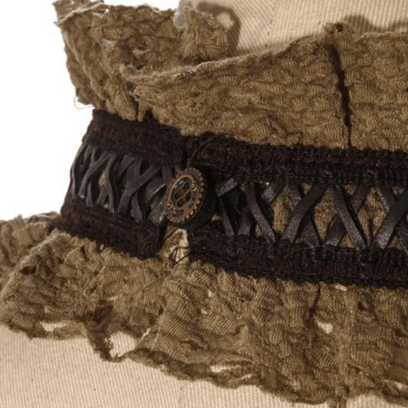 Description:Fully lined lace top has contrast color lace and ribbon trimmings on the front. The short puffed sleeve blouse has a sweetheart neckline with a half opening in the front that is secured by a grommet and lace closure. The blouse comes with a lace neck collar embellished with a metal gear and chain ornament.