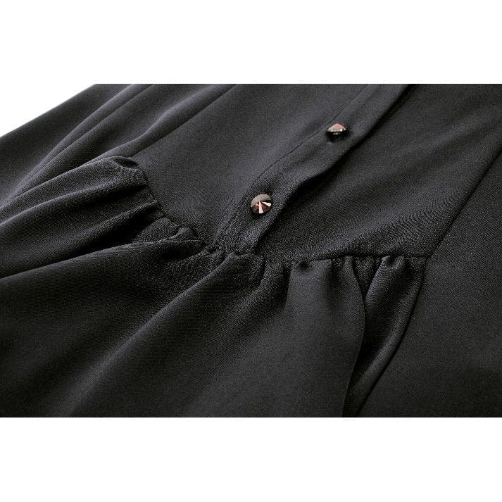 The dress features a ruffled lace stand collar that adds a touch of vintage elegance and frames the face beautifully. This high-neck design enhances the gothic aesthetic, creating a sophisticated and mysterious look.