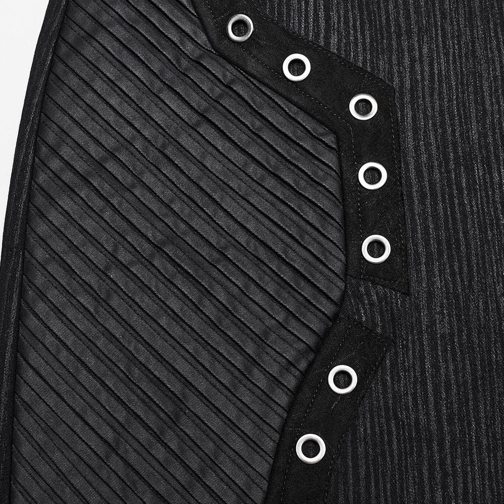 Irregular webbings adorned with metal eyelets are prominently displayed on the front, serving as both decorative and functional details. The eyelets punctuate the skirt with a touch of industrial flair, creating a visual focal point that reinforces its punk aesthetic. These webbings, combined with the pleated design, introduce a unique texture contrast that adds to the skirt’s rebellious charm.