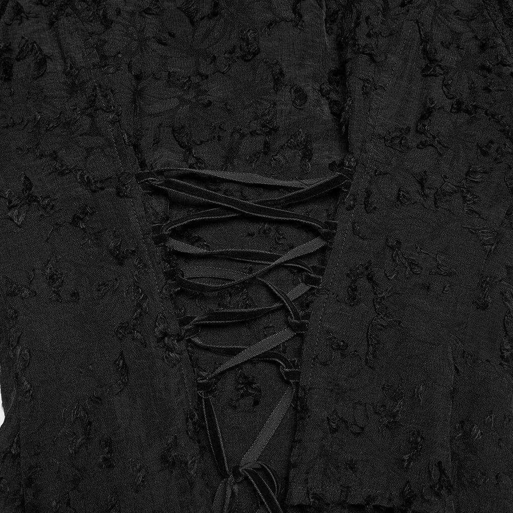 Women's Gothic Ruffled Stand Collar Short Sleeved Shirt is a standout for gothic fashion lovers—blending victorian gothic charm with edgy texture. This distinctive shirt features a sleek stand collar, ruffled detailing, and puff short sleeves framed by intricate lace fabric. At the back, a lace-up closure adds dramatic alt flair, while its slim fitted silhouette hugs the figure gracefully.