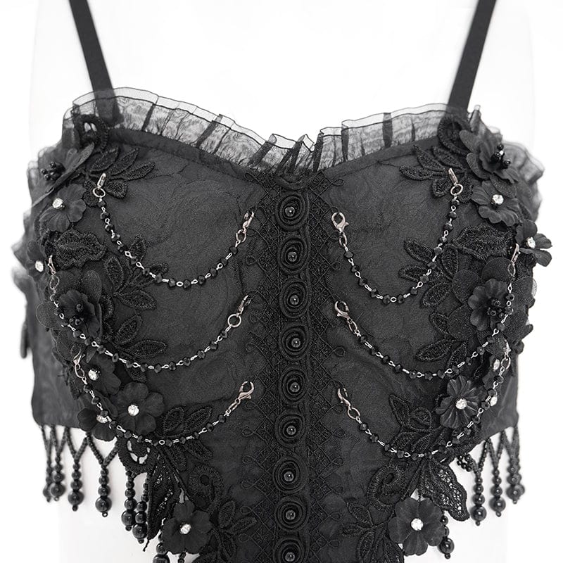 The corset-inspired bodice, adorned with intricate lace embroidery, cutout details, and beaded fringe, accentuates the waist while adding a touch of gothic vampire mystique. The slim shoulder straps lend a delicate balance, enhancing the lace-up detailing that cinches the silhouette for a flattering fit. The flowing A-line skirt, crafted from lightweight sheer fabric, drapes elegantly, making every movement effortlessly graceful.