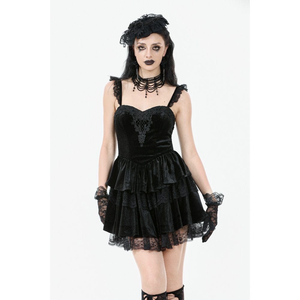 Women's Gothic Flower Embroidered Multilayer Lace Velet Slip Dress