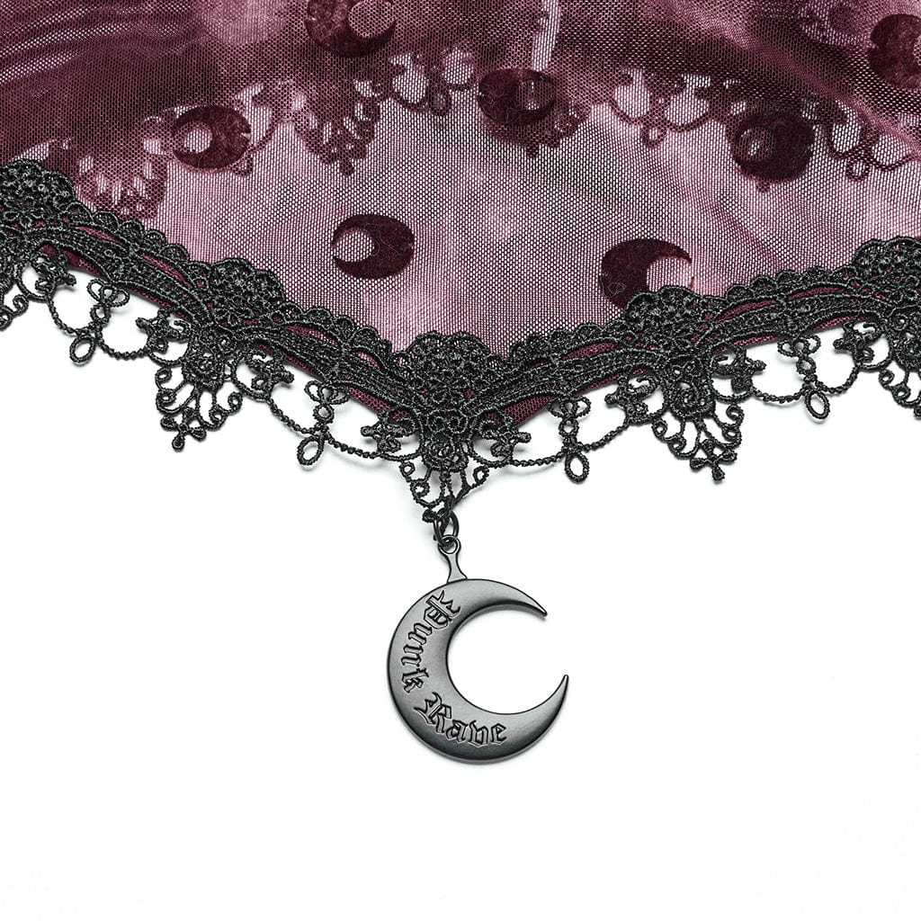 The dress is paired with a cape that adds a dramatic flair, flowing gracefully over the shoulders. The intricate lace trim along the neckline and cape edges provides a vintage gothic victorian touch, while the crescent moon pendant at the center of the neckline serves as the perfect finishing detail. The lace-up back allows for an adjustable fit, making the dress customizable to your body shape.