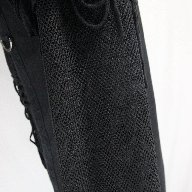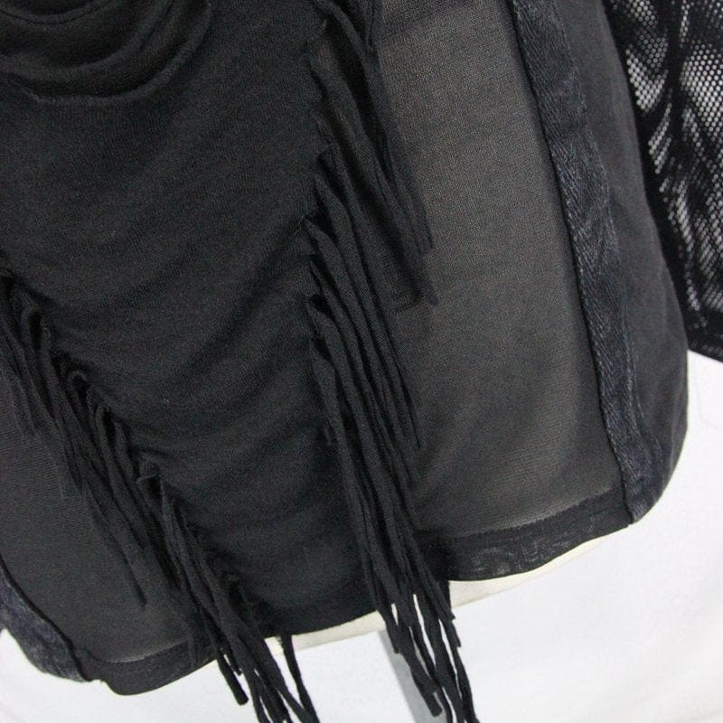 Description:Clever use of mesh and distressed ripped fabric makes this t-shirt very desirable. The mesh is used as an underlayer to the ripped fabric that offsets the full rip patterns beautifully. The D ring studded straps that run from the shoulder to the hem complete the styling.