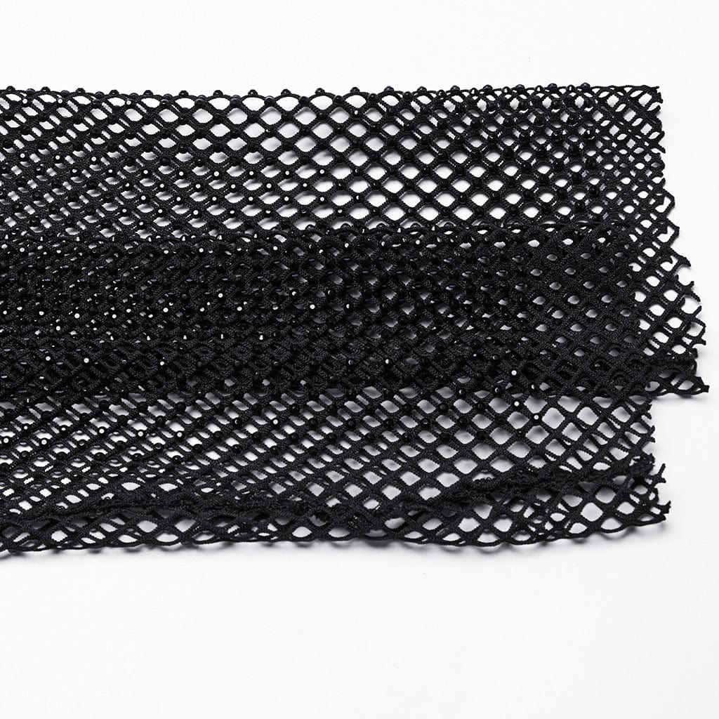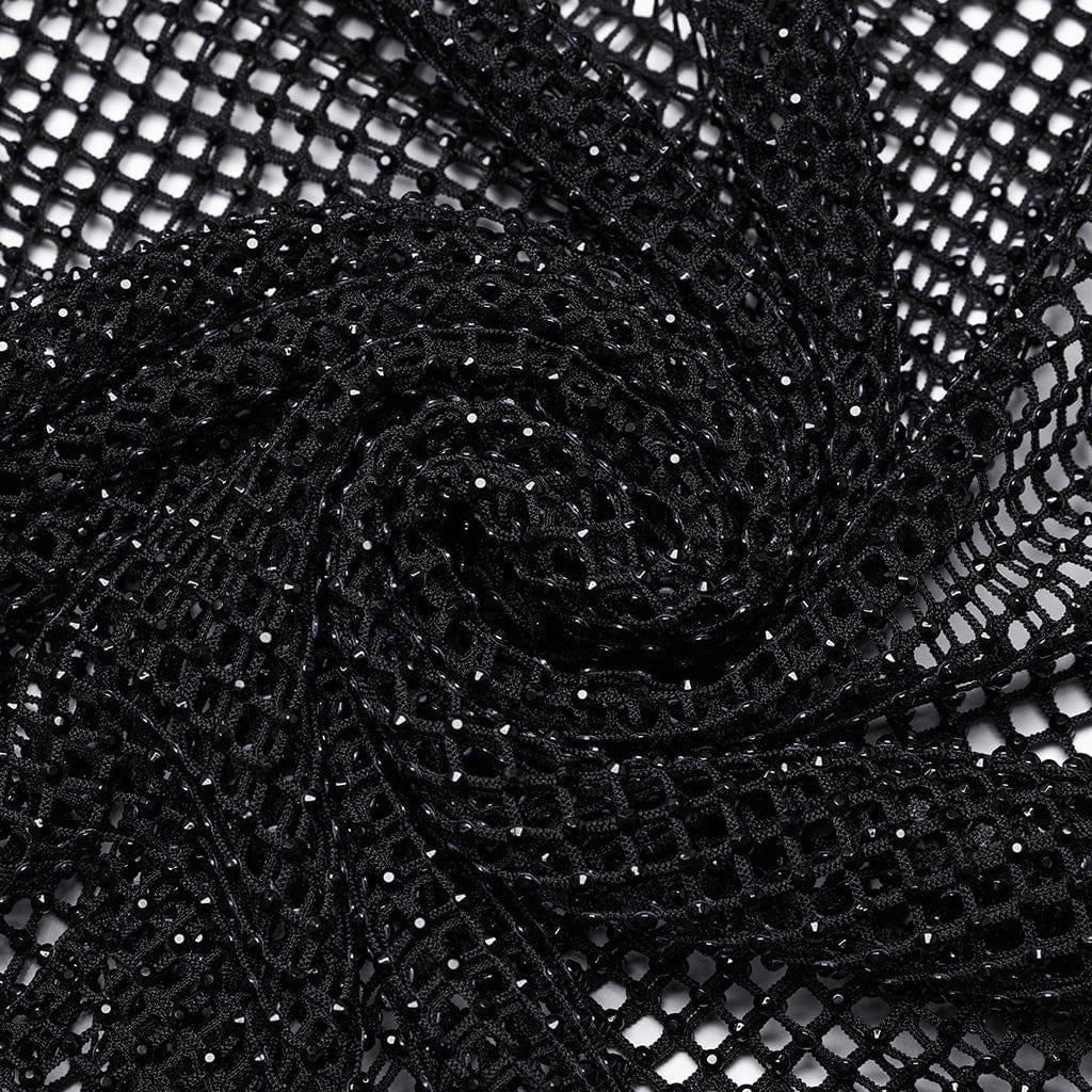 The bodysuit features a diamond-perspective mesh adorned with high-gloss rhinestones, creating a dazzling texture that catches and reflects light from every angle. This intricate rhinestone detailing enhances the bodysuit's overall texture, adding a touch of glamour and a bold, eye-catching effect that complements its punk-inspired design.