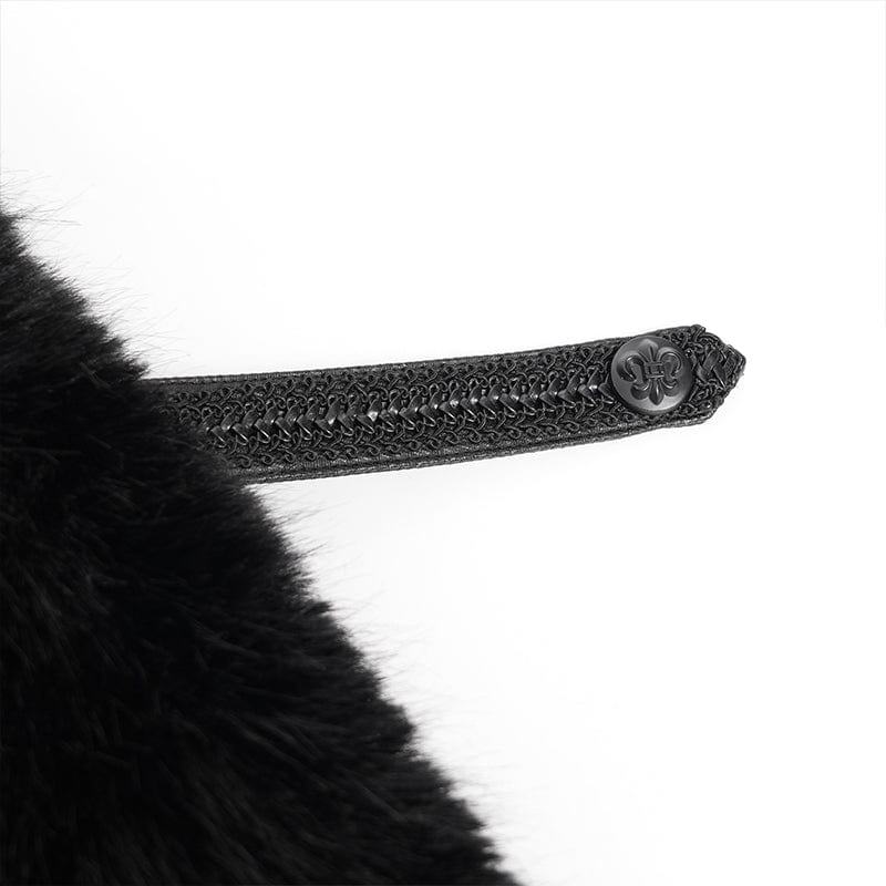 The hood is framed by a lush, fluffy faux fur collar, evoking the silhouette of a beast lying in wait amid the dark, adding a sharp edge of opulence. Gothic lace along the sides and vintage clasps at the placket stitch the eerie grandeur of the medieval era into every thread.