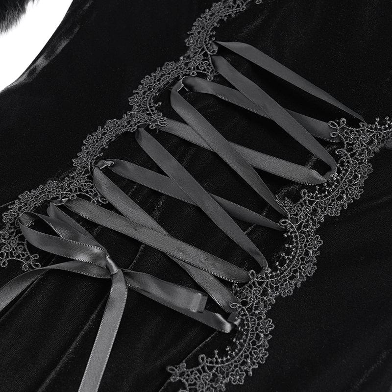 Women's Gothic Floral Embroidered Mesh Splice Lace-up Hooded Dress Black