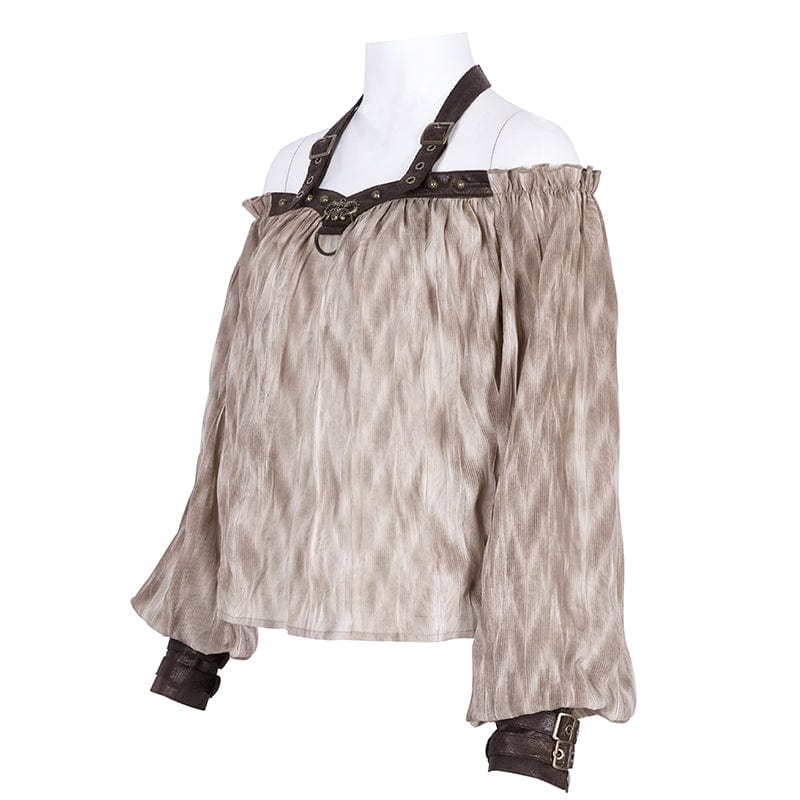 Women's Steampunk Buckle-up Halter Long Sleeve Blouses Coffee