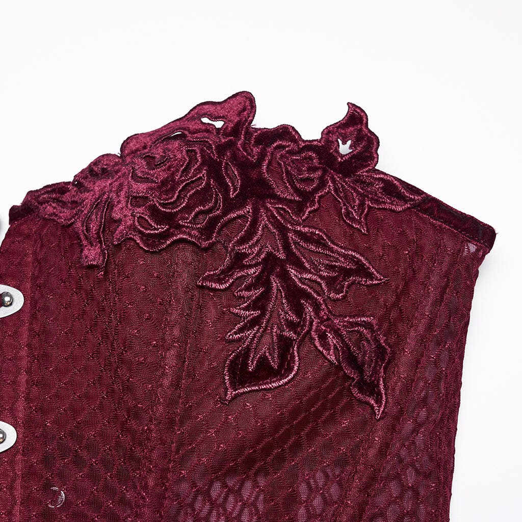 Women's Gothic Decal Sheer Lace-up Overbust Corset is a bewitching goth staple that blends victorian gothic romance with alchemy gothic mystique. This slim fitted silhouette features a sheer mesh base, a front placket of metal buttons, and floral decal details at the bust and hip, with an adjustable lace-up back for a tailored fit.